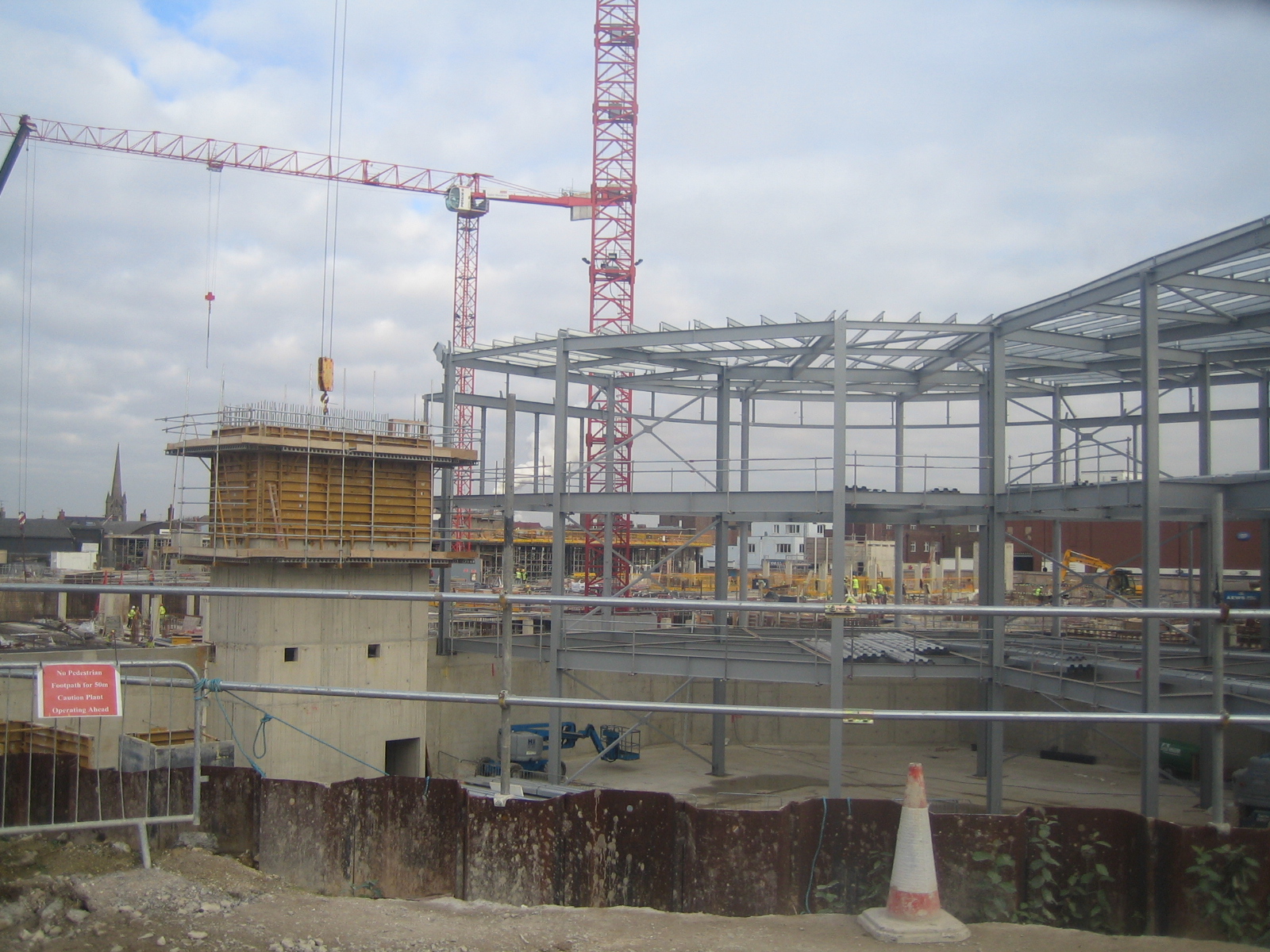 Work on the cattle market site redevelopment, which opened in 2009. Debenhams store ironwork. See St John's church spire in the background. |