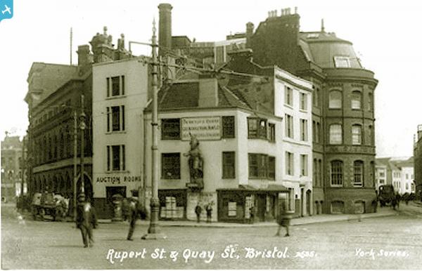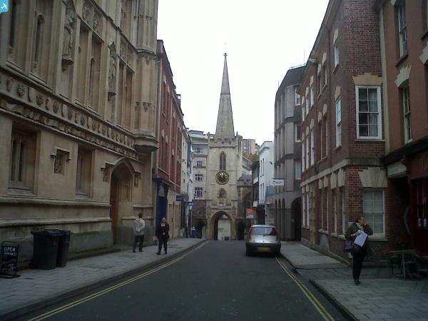 Corn Street runs to the right of the photograph, from the corner of Baldwin Street, up to Wine Street and High Street. St John's on the Wall also had Broad Street running from it up to Corn Street. |