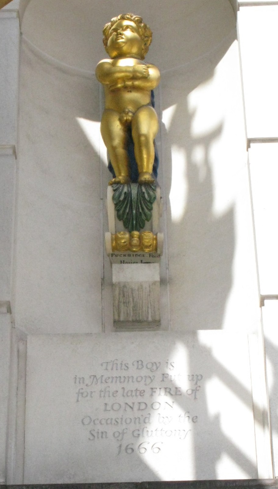 The 'Fat boy' effigy recording facts about the Great Fire of 1666. The inscription beneath reads "This boy in memmory(!) put up for the late Fire of London occasion'd by the Sin of Gluttony 1666". There is a further inscribed stone below which additionally reads "The Golden boy of Pye Corner". The boy at pie corner was erected to commemorate the staying of the great fire which beginning at Pudding Lane was ascribed to the sin of gluttony when not attributed to the papists as on the monument, and the boy was made prodigiously fat to enforce the moral. He was originally built into the front of a public house called the 'Fortune of War' which used to occupy this site and was pulled down in 1910. The inscription continues further as well. |
