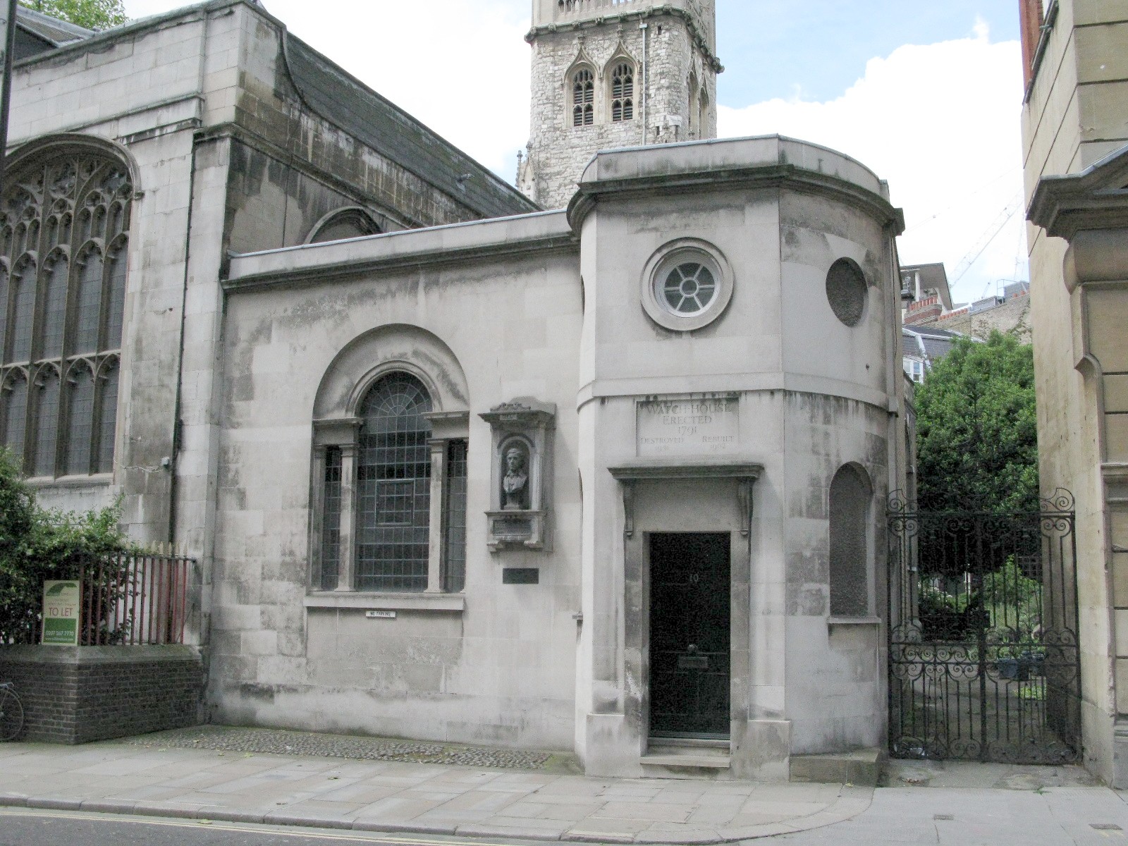 The City 'Watch-house' in Giltspur Street. The inscription over the door reads " Erected 1791, destroyed 1941, rebuilt 1962" |