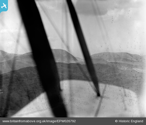 Pennawd | [EPW026792] Red Screes and the Kirkstone Pass viewed through the aircraft wing over The Hundreds, Ambleside, from the south, 1929 |