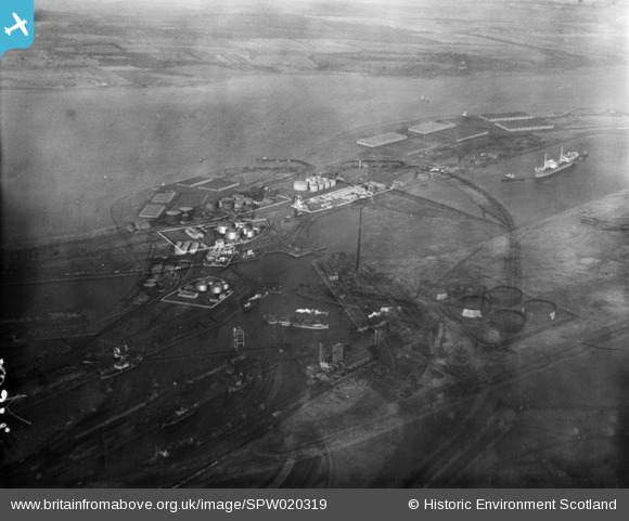 SPW020319 SCOTLAND (1928). Grangemouth Docks, general view, showing Grange Dock and the Eastern Channel. An oblique aerial photograph taken facing north. This image is double exposed.