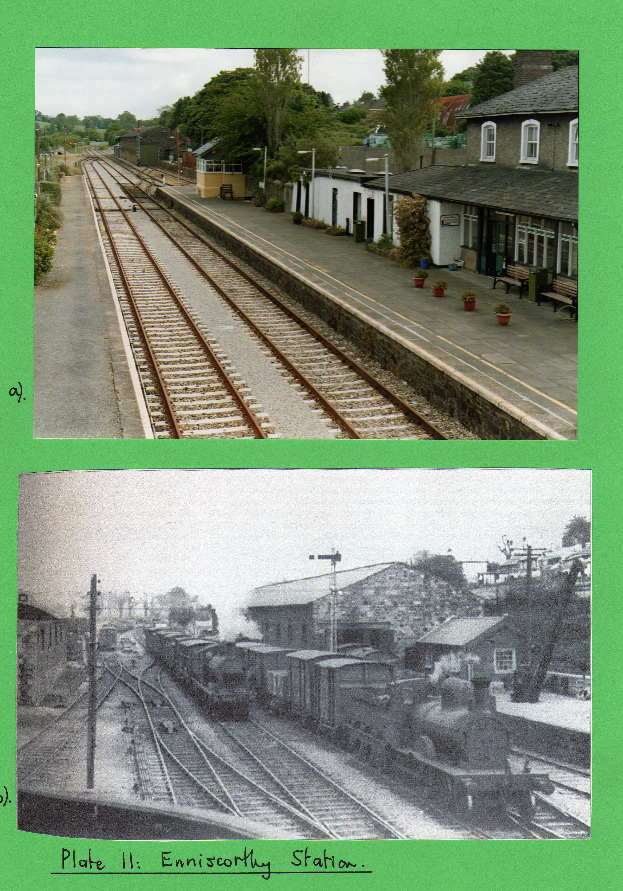 |   Enniscorthy Railway station in 1935 and 2005. The Great Southern Railway shot shows the engine shed on the left and the goods store opposite in a view at the Dublin end of the platform taken from the water tower, looking in a north-easterly direction. Water for the two columns was taken from the Slaney River by steam pump. The busy nature of the station is clearly indicated by the presence of two locomotives and numerous wagons in the sidings. The 2005 photo is looking from the footbridge towards the main station buildings, with the signal box and goods shed beyond. Most of the traffic at the station is now concerned with commuters to and from Dublin. | John Swain | Monday 13th of October 2014 01:39:57 PM |