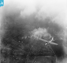 [EPW034858] De Havilland DH80A Puss Moth G-ABGR in flight, Burnt Oak, from the south-west, 1931