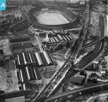 [EPW053781] Shepherd's Bush, traffic queuing and crowds gathered within and outside the White City Stadium for a Greyhound Race Meeting, 1937
