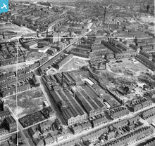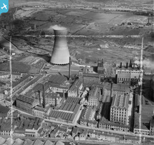 [EAW004429] The Hargreaves Spindle Works at Coldhurst, Oldham, 1947. This image was marked by Aerofilms Ltd for photo editing.
