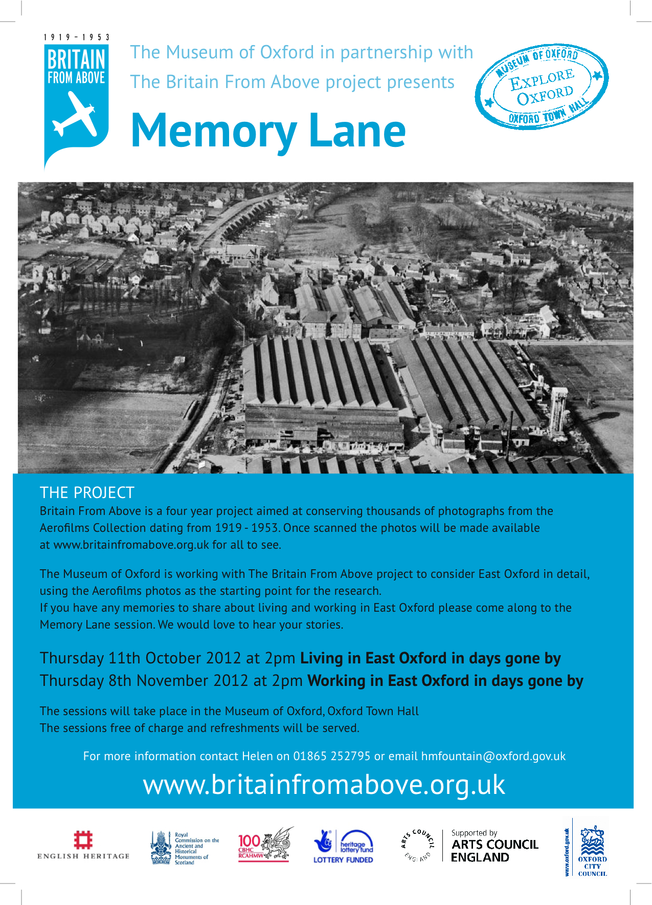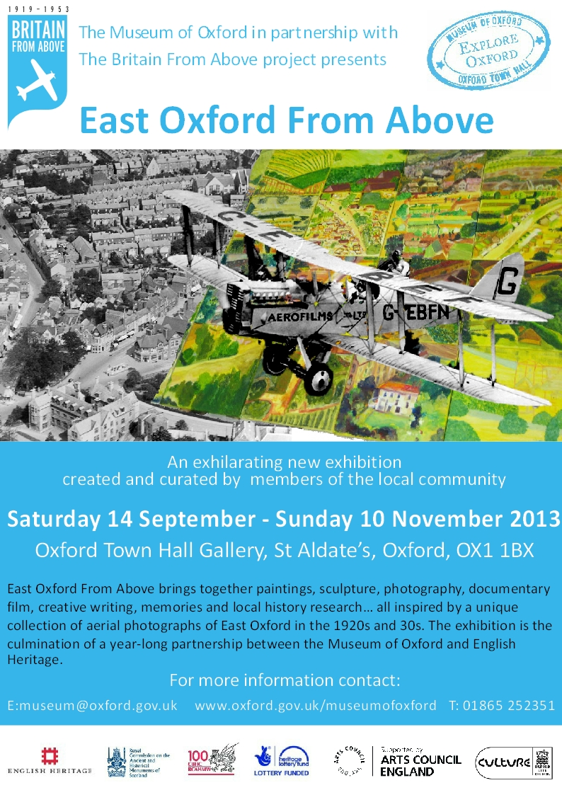 We are pleased to be delivering a partner project with Britain From Above. The project is called Oxford From Above. Aerofilm photos of East Oxford from the Britain From Above website will used to inspire a a variety of community arts activities. The first of these is Memory Lane, a reminscecne session at 2pm on 11th October. The session is entitled Living in East Oxford and anyone is welcome to join in. It takes place in the Heritage Learning Centre in Oxford Town Hall.