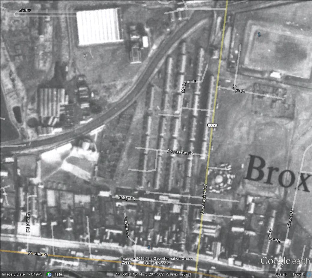 Just north of the Pumpherston refinery, the Broxburn Oil Company constructed new mines, oilworks including a bank of Henderson patent retorts and company village at Roman Camps in 1892. It continued in production until c.1955 and was mostly cleared by c1958. The manager's house was still in existence in 1998