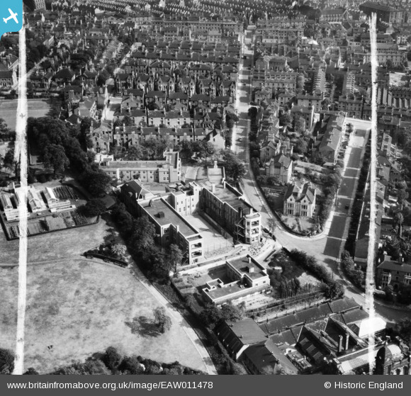 EAW011478 ENGLAND (1947). The Nottingham Hospital for Women on Peel Street and the surrounding residential area, Nottingham, 1947. This image was marked by Aerofilms Ltd for photo editing.