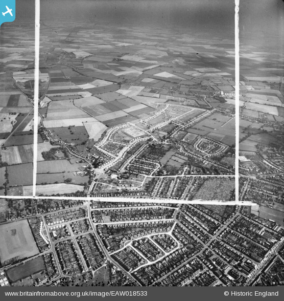 | Title | [EAW018533] New housing development under construction at Dogsthorpe and environs, Peterborough, from the west, 1948. This image was marked by Aerofilms Ltd for photo editing. |