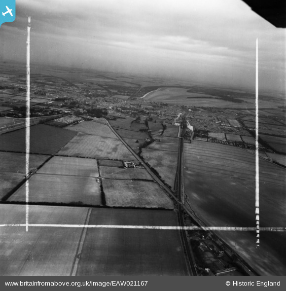 | Title | [EAW021167] Wyck Hall Stud, Dullingham Road and the town, Newmarket, from the south-west, 1949. This image has been produced from a print marked by Aerofilms Ltd for photo editing. |