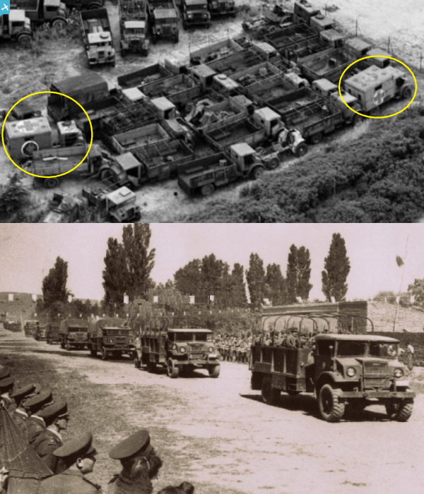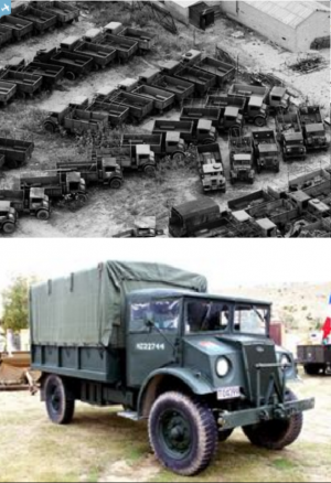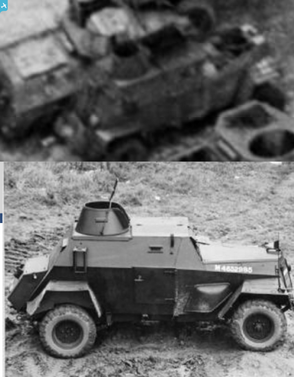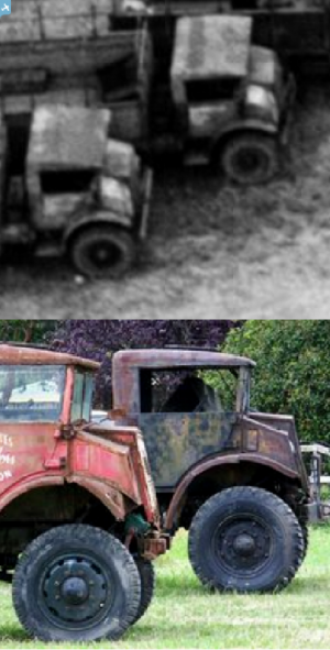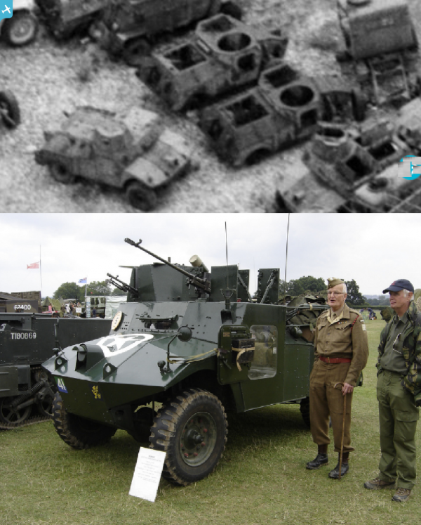 A mass of surplus army vehicles, including a couple of armoured cars and two or so ambulances, stored in yard |