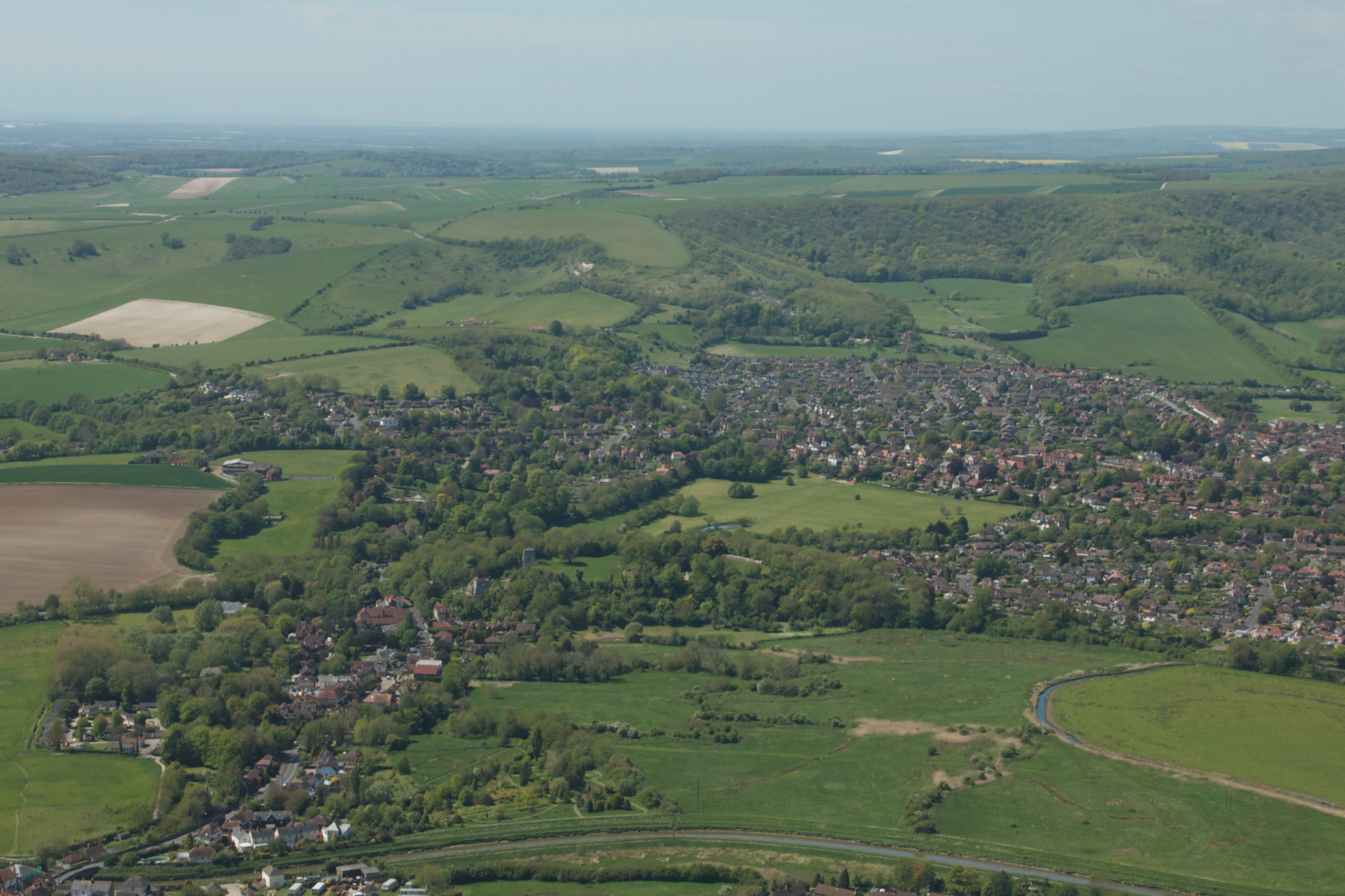 Attached is an aerial photo I took in May 2015. Look at the 1950 picture and note the large recreation ground in the bottom LH quartile of the picture (bounded at the bottom by a railway line and to the left, by a road). Now look at my picture which shows the same recreation ground in the centre of the picture. Note how local trees have become more established, especially on the north escarpment of the South Downs. And notice the abundance of new buildings which have spread out onto the fields which used to be there. |