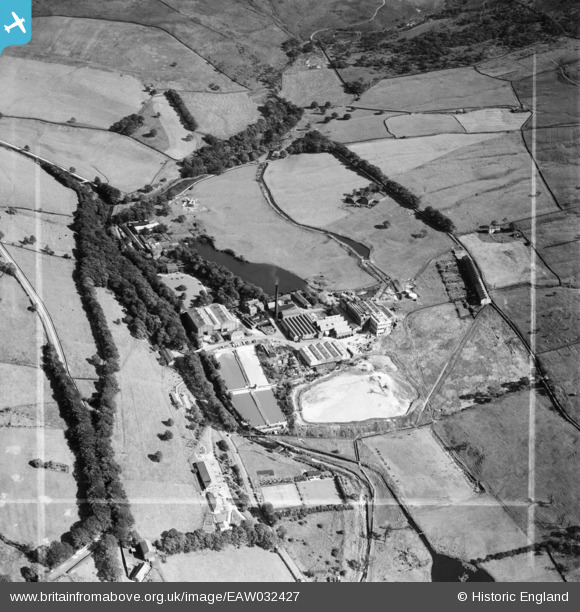 EAW032427 ENGLAND (1950). The Greenfield Paper Mill and Hey Top, Greenfield, 1950. This image was marked by Aerofilms Ltd for photo editing.