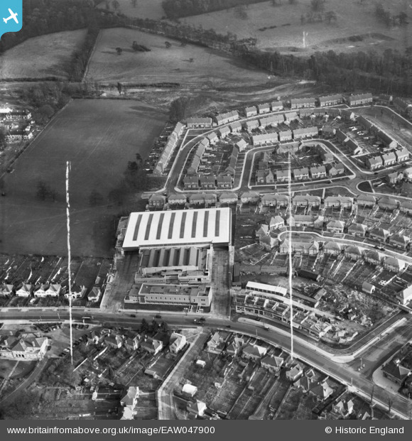 EAW047900 ENGLAND (1952). The London Transport Executive Garston Garage, Bovingdon Crescent and environs, Garston, 1952. This image was marked by Aerofilms Ltd for photo editing.