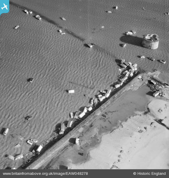 EAW048278 ENGLAND (1953). Caravans and debris washed up against the inside of the sea wall at St Osyth Beach to the west of Martello Tower C, Seawick, 1953