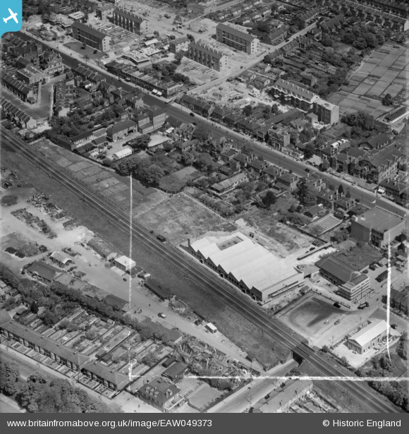 EAW049373 ENGLAND (1953). The MK Electric Ltd Factory on Park Road and environs, Edmonton, 1953. This image was marked by Aerofilms Ltd for photo editing.