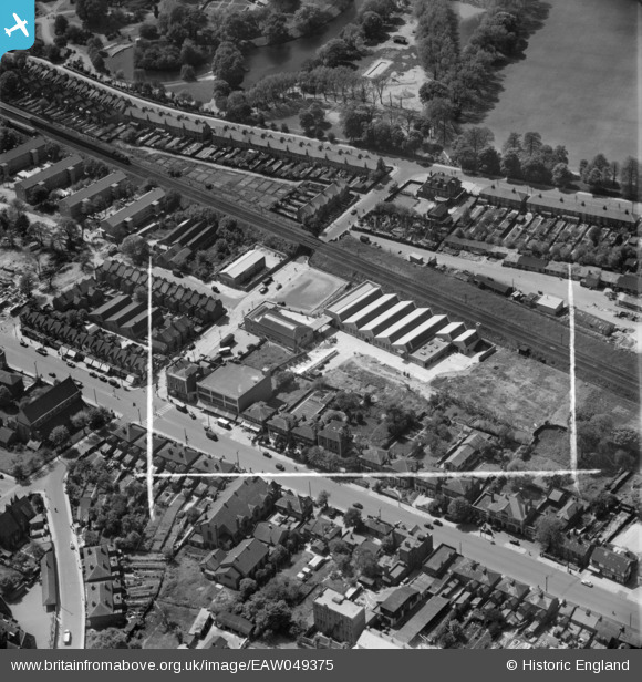 EAW049375 ENGLAND (1953). Fore Street, the MK Electric Ltd Factory on Park Road and environs, Edmonton, 1953. This image was marked by Aerofilms Ltd for photo editing.