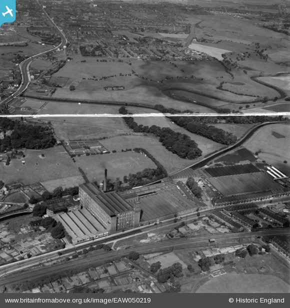 EAW050219 ENGLAND (1953). Throstle Bank Cotton Mill and environs, Hyde, 1953. This image was marked by Aerofilms Ltd for photo editing.