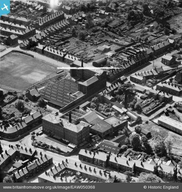 EAW050368 ENGLAND (1953). The Henry and Leigh Slater Card Factory (Chester Road Mills), Oxford Road and environs, Macclesfield, 1953. This image was marked by Aerofilms Ltd for photo editing.
