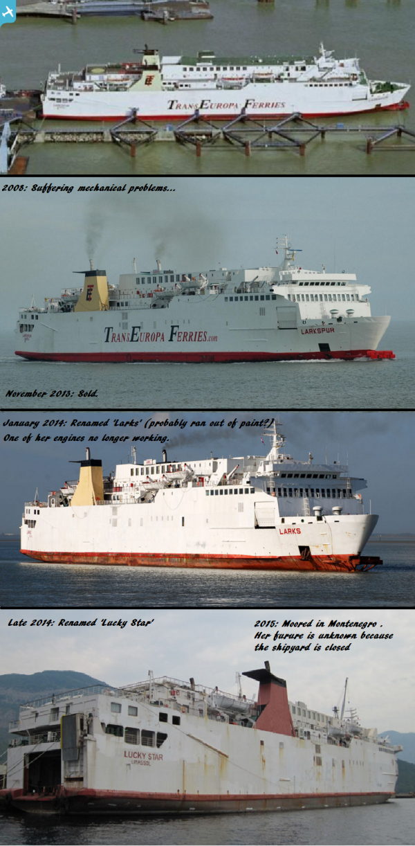 The MV Larks is a ferry previously operated by TransEuropa Ferries between 1999 and April 2013 as MV Larkspur. After TEF went bankrupt in April 2013 the ship has remained laid up in Oostende in Belgium. She was sold in December 2013 to an unknown buyer and then sold again to Oilchart, a local bunkering company, for more than E400K. Her name was then shortened to Larks. She briefly served with the Greek ferry operator Egnatia Seaways but after financial issue from within Egnatia she was laid up and was renamed Lucky Star on the 01/09/2014 and was registered to Velenio Shipping Co Ltd, Athens, Greece at the same time of her renaming.