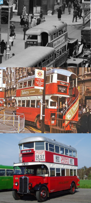 At the start they had petrol engines, but experiments with diesel engines soon convinced London Transport that this was the way to go with the LT class. A conversion programme in 1934 saw many of the LTs converted, with their petrol engines going to new STL buses. Most of the remaining double-deckers were converted in 1939 and 1940 but a substantial number retained petrol engines to the end of their days, including nearly all the open staircase variety. These should have been replaced by new RTs in 1940, but the war delayed this programme. So it was still possible after the war to travel in central London on an open-staircase petrol-engined bus: but not for long! |