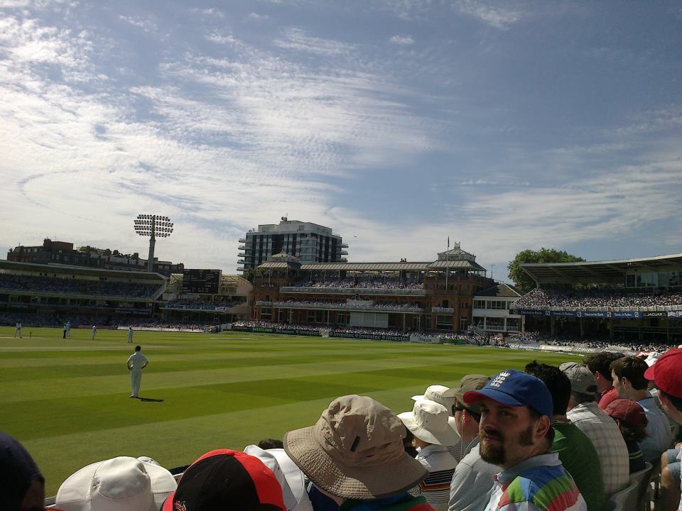 Day 3 of the Lords test in the 2012 England v South Africa series. The pavilion/members stand much as it's always been, but note the fairly recent flood lights for day/night games. |