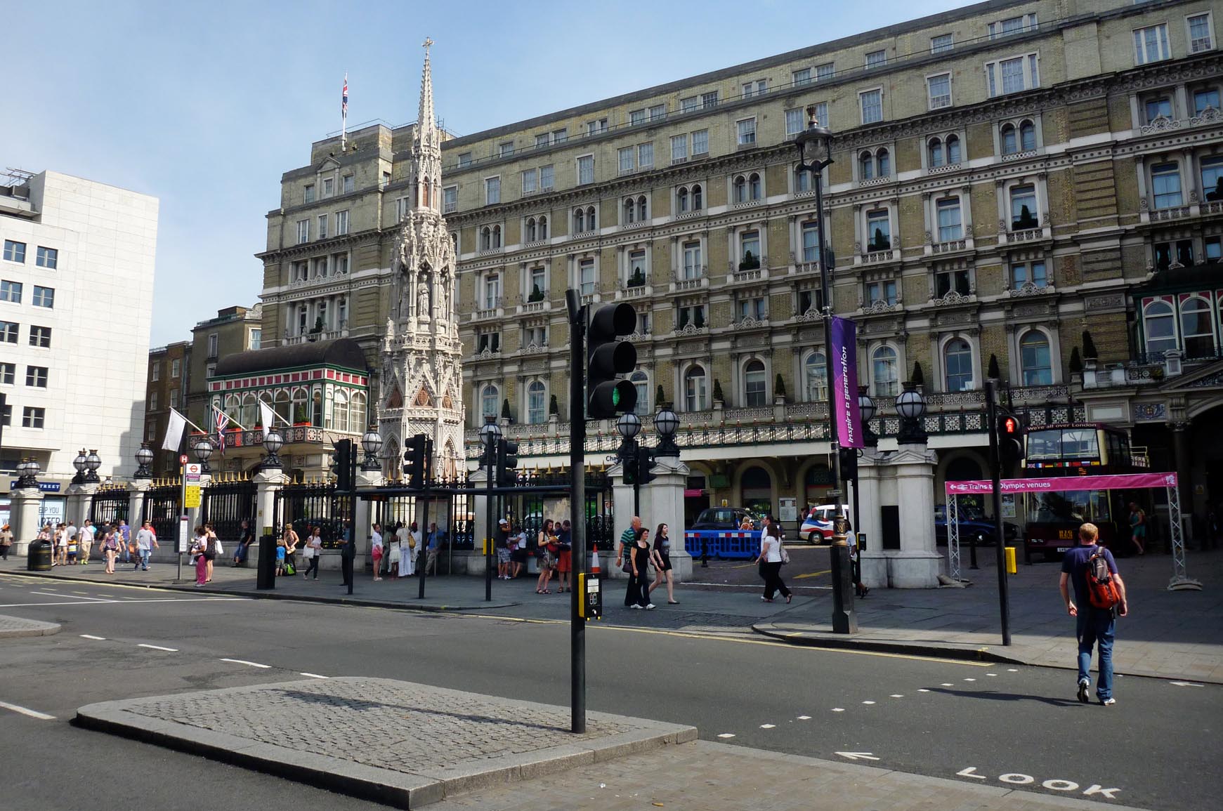 This is the Charing Cross, one of a series of crosses erected to mark the funeral path of Queen Eleanor. This link explains.http://en.wikipedia.org/wiki/Eleanor_cross |