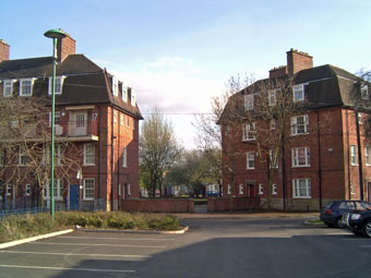 This image shows the Penn Avenue flats in Old Lenton, Nottingham. They were built in 1926 by Jesse Boot for his own employees and local residents whose homes were demolished to make way for Abbey Bridge road. Enlarged you can clearly see the Lenton war memorial and Albert Ball VC Memorial Homes. In the centre above the flats is Holy Trinity Church, Lenton's parish church. Information supplied by Robert Howard. |