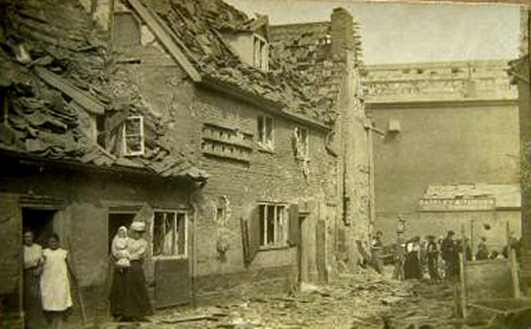 ![]() Ruin of cottage in White Lion Yard This area of Church Street suffered the most damage from the Zepperlin bombing raid of 8th Sept 1915, the cottage was never rebuilt. The postcard by H. T. Cave shows the dazed cottagers the morning after the raid. |