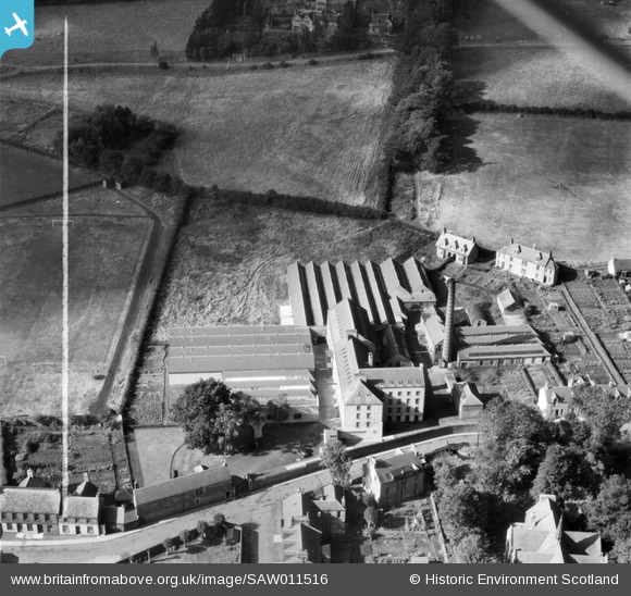 SAW011516 SCOTLAND (1947). Ballantyne's Cashmere Caerlee Mills, Damside, Innerleithen. An oblique aerial photograph taken facing west. This image has been produced from a crop marked negative.