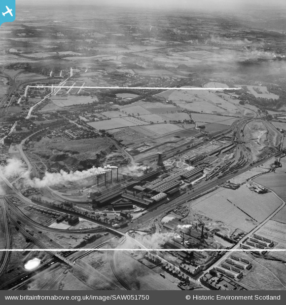SAW051750 SCOTLAND (1953). New Stevenston, general view, showing Stewarts and Lloyds Ltd. Clydesdale Steel and Tube Works, Clydesdale Street and St Patrick's Cemetery. An oblique aerial photograph taken facing south-east. This image has been produced from a crop marke