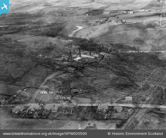 SPW020590 SCOTLAND (1928). Castlecary Fireclay Works and Limeworks, Castlecary. An oblique aerial photograph taken facing north. This image is double exposed.