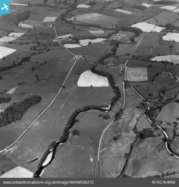 WAW036272 WALES. View of the Tanat valley showing railway and Pen-y-bont Llanerch Emrys. Oblique aerial photograph.