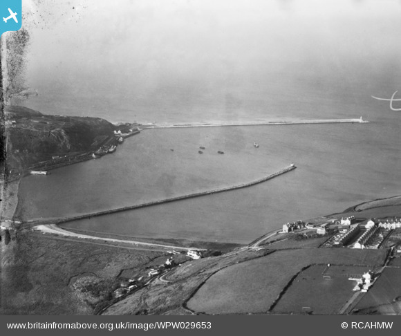 WPW029653 WALES (1929). View of Fishguard & Goodwick Harbour, oblique aerial view. 5"x4" black and white glass plate negative.