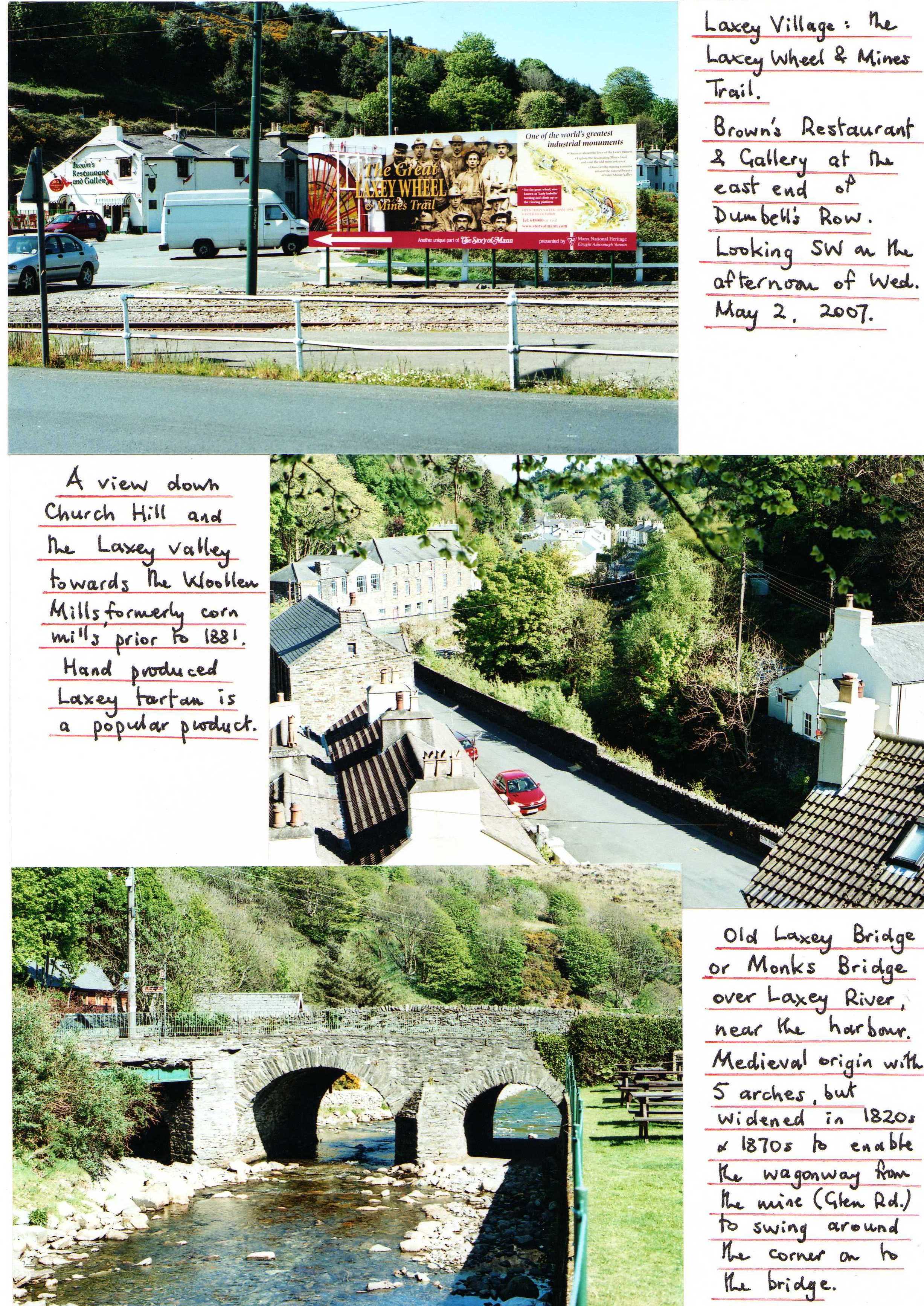 On a fine day in early May 2007, the writer made the trip up to Snaefell on the Snaefell Mountain Railway, from Laxey Station, before making the descent on foot into Laxey Glen. The trail included Snaefell Mine, the Woollen Mills, Monks Bridge and Laxey Harbour, as shown on some of the accompanying photos. |
