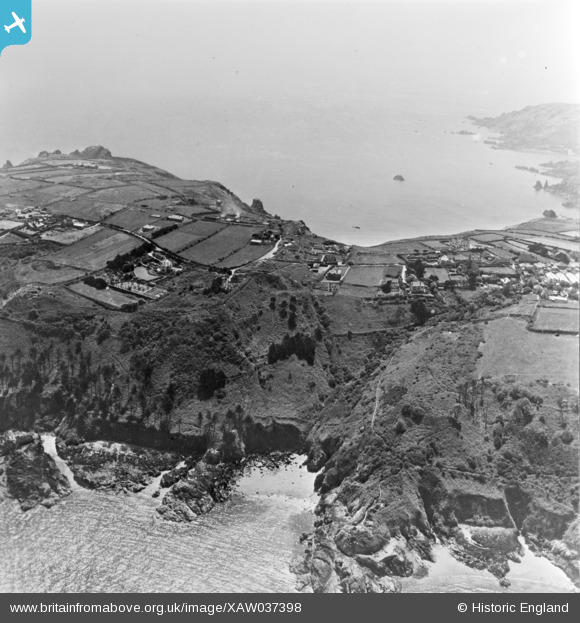 XAW037398 GUERNSEY (1951). Pied du Mur, Moulin Hurt and Boylet Column, Jerbourg, Guernsey, Guernsey, 1951. Oblique aerial photograph taken facing South/West.