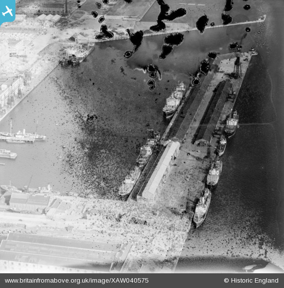 XAW040575 IRELAND (1951). Dublin Docks, Dublin, Dublin, Ireland, 1951. Oblique aerial photograph taken facing East. This image has been produced from a damaged negative.