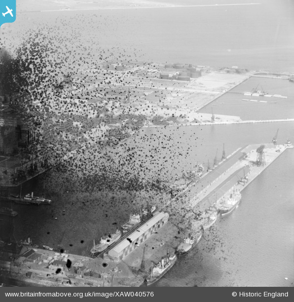 XAW040576 IRELAND (1951). Dublin Docks, Dublin, Dublin, Ireland, 1951. Oblique aerial photograph taken facing North/East. This image has been produced from a damaged negative.