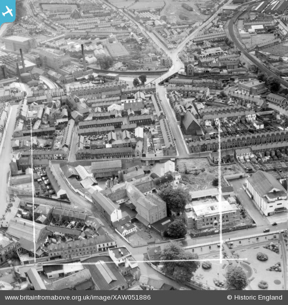 XAW051886 NORTHERN IRELAND (1953). Robert Morton & Co. Ltd., Ballymena, Co. Antrim, Northern Ireland P.3347, Ballymena, Ballymena, Northern Ireland, 1953. Oblique aerial photograph taken facing South. This image was marked by Aerofilms Ltd for photo editing.