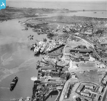 [EAW008939] The Middle Docks & Engineering Company Ltd Ship Repair Yard at Middle Docks and environs, South Shields, 1947. This image was marked by Aerofilms Ltd for photo editing.