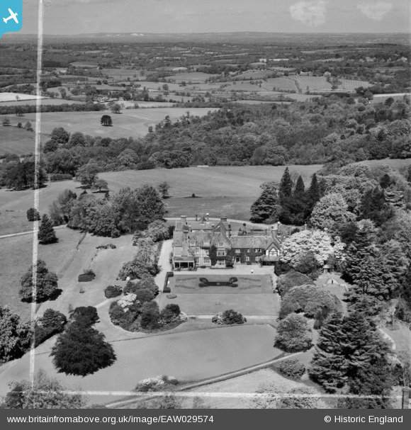 eaw029574 ENGLAND (1950). Plawhatch Hall and the surrounding countryside, Forest Row, from the south-east, 1950. This image was marked by Aerofilms Ltd for photo editing.