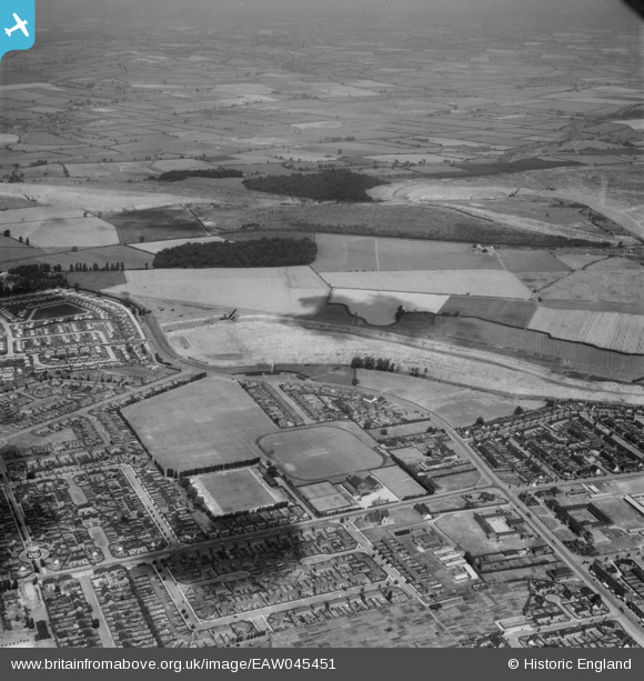 eaw045451 ENGLAND (1952). Occupation Road Football Ground and the surrounding residential area, Corby, from the south, 1952